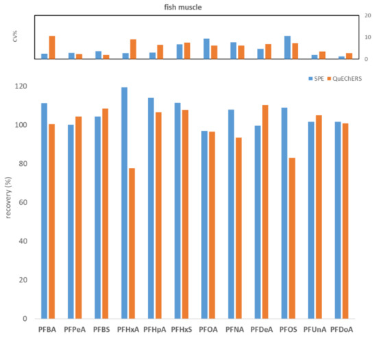 Comparison between SPE and QuEChERS in terms of repeatability (calculated as CV% of seven replicates at 100 ng/kg) and recovery (calculated as the average of seven replicates at 100 ng/kg) for the fish muscle matrix.
