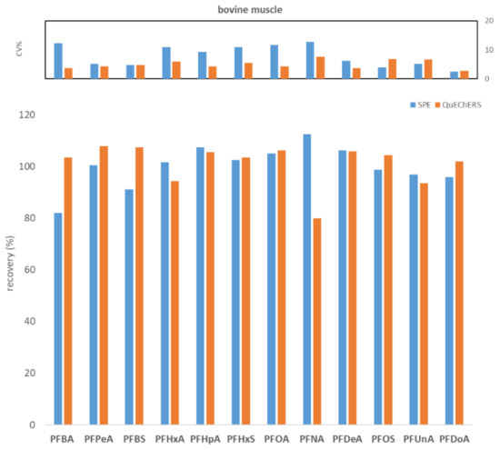 Comparison between SPE and QuEChERS in terms of repeatability (calculated as CV% of seven replicates at 100 ng/kg) and recovery (calculated as the average of seven replicates at 100 ng/kg) for the bovine muscle matrix.