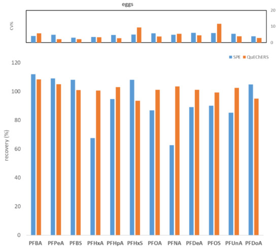 The first preliminary test highlighted comparable results in terms of recovery and repeatability for the two different procedures (Figure 1, Figure 2 and Figure 3). In fact, for all three tested matrices (fish muscle, bovine muscle, and eggs) the corresponding spiked samples at 100 ng/kg had a recovery in the range 80–120% for all compounds, except for the egg matrix where PFHxA and PFNA had the worst recoveries (67.7% and 62.7%, respectively) with the SPE procedure. As to repeatability, all the tested analytes/matrices had a CV% below 20% with both clean-up procedures.