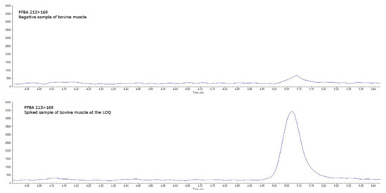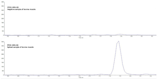 Specificity was assessed in blank matrices verifying the absence of a signal higher than 30% of the LOQ level (an example for bovine muscle is shown in Figure 4 and Figure 5 and in Figures S1–S11 in the Supplementary Materials). Taurodeoxycholic acid (TDCA), one of the most well-known PFOS-interfering substances found in matrices of animal origin (mainly eggs and offal) [16], was separated by chromatography.