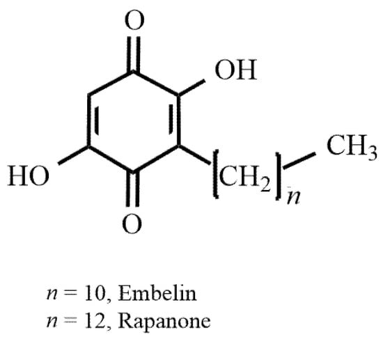 - Othman, S.N.N.; Lum, P.T.; Sekar, M.; Mazlan, N.A.; Yusri, P.Z.S.; Ghazali, N.F.; Mohd, I.M.; Shazalyana, A.; Ismail, M.; Noor, A.A.M. Molecules of interest–embelin—A review. Res. J. Pharm. Technol. 2020, 13, 3485–3493. [Google Scholar] [CrossRef]
