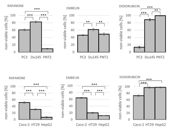 Cytotoxic activity of rapanone, embelin, and doxorubicin at 10 μg/mL towards cell lines of prostate and gastrointestinal panels (see Material and Methods section for cell line descriptions); ** p < 0.01, *** p < 0.001.