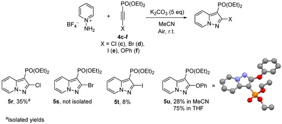Next, the applicability of 2-halogenated and 2-OPh alkynylphosphonates 4c–f in the cycloaddition reaction with pyridinium-N-imines was studied (Scheme 4). For all halogenated alkynes, the reaction resulted in the formation of complex reaction mixtures from which corresponding 2-Cl and 2-I-pyrazolopyridines 5r,t were isolated with a low yield. Investigation of the reaction mixtures using NMR 31P and GC-MS for alkyne 4c showed the formation of a significant amount of dehalogenated product 5k when DMSO was used as a solvent. Various solvents were screened and the maximum yield of 5r was reached in MeCN with K2CO3 as a base, while the nature of the inorganic base had no remarkable effect on the ratio of 5r:5k. When the excess of salt 1 was taken, formation of 2-aminopyrazolo[1,5-a]pyridine along with products 5k and 5r was also observed. In contrast to halogenated acetylenes 4c–e, the cycloaddition reaction of OPh-substituted phosphonate 4f in THF resulted in a good yield of pyrazolopyridine 5u. The regioselectivity for product 5u was confirmed using X-ray analysis [50].