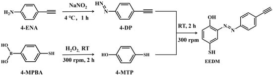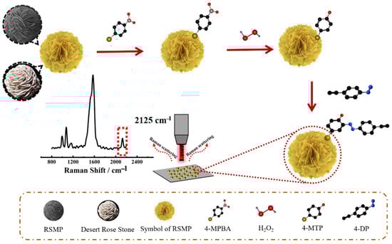 The SERS sensing mechanism is shown in Figure 1. Firstly, we synthesized Au-based ”rose stone-like” microparticles named RSMPs due to their appearance which is similar to rose stones found in deserts. Their layered structure carrying multiple nanoplates provides abundant nanogaps and edges within RSMPs, which can generate hotspots for the SERS enhancement, resulting in the RSMPs being an excellent SERS substrate. 4-MPBA can be modified on RSMPs via the Au-S bond, and the reaction of 4-MPBA with H2O2 can transform the phenylboronic acid group into a phenol group [30]. Subsequently, 4-DP (4-Diazonium-phenylalkyne) can react with phenol to form an azobenzene compound carrying an alkyne group, which has a “silent region” Raman fingerprint (2125 cm−1). The amount of alkyne group on the SERS particle surface is dependent on the formation of the phenol group, which is determined by the H2O2 concentration, therefore, H2O2 can be profiled with significant sensitivity owing to the high signal/noise SERS measurement. Figure 2 demonstrates the synthesis of 4-DP and the H2O2-induced azo reaction. 4-ENA reacts with NaNO2 in acidic conditions to generate 4-DP. Eventually, the diazonium group of 4-DP reacts with the phenol generated by the reaction of 4-MPBA and H2O2 to form an azobenzene derivative EEDM ((E)-2-((4-ethynylphenyl)diazenyl)-4-mercaptophenol).