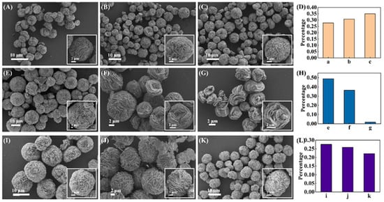 Figure 5. SEM images of RSMP proportion under different conditions. (AC) RSMP prepared with 3/4/5 mg/mL NAAN, 1.6 mg/mL PVP, 24 h. (EG) RSMP prepared with 0.4/3.2/12.8 mg/mL PVP, 5 mg/mL NAAN, 24 h. (IK) The time of RSMPs preparation was 24/72/120 h, respectively, with 0.4 mg/mL PVP, 5 mg/mL NAAN; (D,H,L) Histogram of the proportion of the generated particles under different synthesis conditions.