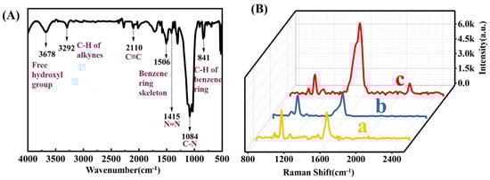 Figure 7. (A) FT-IR spectrum of 4-DP; (B) the Raman spectrum of RSMP@4-MPBA (line a), probe+4-DP (line b), probe@H2O2@4-DP (line c).
