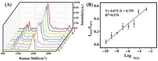 Figure 8. (A) The Raman spectrum of RSMP@4-MPBA that reacted with different H2O2 concentrations of (a–i): 0, 0.1 nM, 1 nM, 10 nM, 100 nM, 1 μM, 10 μM, 60 μM and 1.5 mM, respectively, then connected with 4-DP; (B) The calibration curve of I2125/I1071 ratio of concentration of H2O2 from 0.1 nM to 1.5 mM.