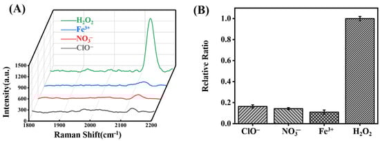 Figure 9. (A) Raman spectra of probes reacted with ClO, NO3, Fe3+ and H2O2 in the range of 1800–2200 cm−1 in the silent region; (B) Normalizing the intensity of the peak at 2125 cm−1 after reaction with 0.06 mM H2O2 and the relative ratios of 10 mM of ClO, NO3 and Fe3+.