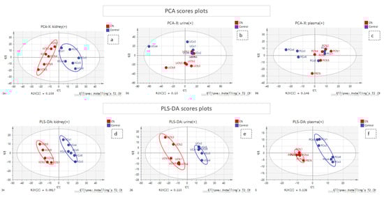 PCA and PLS-DA score plots. The red and the blue points of the score plots represent the Cfz group samples and the Control group samples, respectively. (a) PCA of kidney (+) dataset; (b) PCA of urine (+) dataset; (c) PCA of plasma (+) dataset; (d) PLS-DA of kidney (+) dataset; (e) PLS-DA of urine (+) dataset; (f) PLS-DA of plasma (+) dataset.