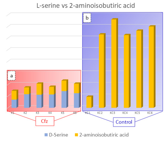 The 2-Aminoisobutyric acid is an amino acid that has been found to be decreased in the kidneys of treated mice. This compound is reported to prevent kidney tubulopathy, as it inhibits the action of D-serine. The D-isomer of serine is a nephrotoxic agent, causing selective necrosis of the S3 segments of proximal tubules. The D-serine is reabsorbed through the proximal convoluted tubule of kidney and is degraded, at the same location by the enzyme D-amino acid oxidase (d-AAO), into the corresponding a-keto acid and ammonia. Moreover, the catabolism of D-serine induces the generation of H2O2 and is assumed to lead to a decrease in renal cellular glutathione, resulting in high production of ROS and oxidative stress. As the structure of 2-aminoisobutyric acid corresponds to that of D-serine, it is possible that the presence 2-aminoisobutyric acid in the kidney prevents the oxidative stress inhibiting D-serine’s catabolism [34,35]. Considering that the decreased levels of 2-aminoisobutiric acid may be involved in kidney injury, provoked by limited inhibition of D-serine catabolism, the correlation between these two compounds in the Cfz and Control kidney mice was studied. The outcome was the detection of increased D-serine levels in Cfz mice, while the compound was not detected in the Control samples, as is represented in Figure 3. The correlation of D-serine and 2-aminoisobutyric acid is also represented in heatmap in the Supplementary Materials. Therefore, the hypothesis that kidney injury caused by oxidative stress conditions induced by the decreased levels of 2-aminoisobutyric acid is verified.