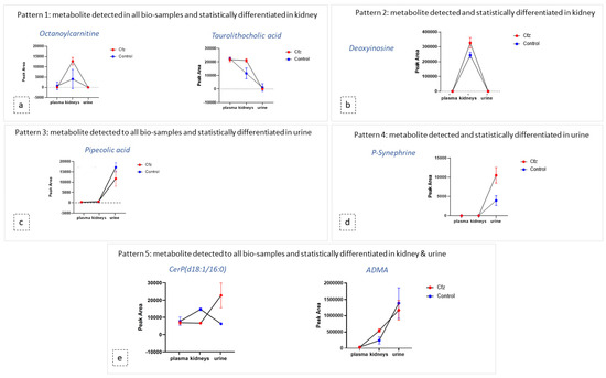 Diagrams of metabolite content (expressed via mean and SD) in the plasma, kidneys, and urine of both Cfz (red) and Control (blue) groups. Each diagram represents a type of the revealed patterns of metabolite distribution among bio-samples: (a) metabolites detected in all biosamples and statistically differentiated in kidney; (b) metabolites detected and statistically differentiated in kidney; (c) metabolites detected in all biosamples and statistically differentiated in urine; (d) metabolites detected and statistically differentiated in kidney (e) metabolites detected in all biosamples and statistically differentiated in kidney and urine.