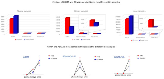 The ADMA showed differences in two types of samples (kidney and urine) and was identified as a feature corresponding to ADMA’s mass, and it was also attributed to two features corresponding to products of ADMA’s metabolism. Non-metabolized ADMA was detected in all samples and increased in kidneys of the Cfz group, whereas the respective levels of ADMA in plasma and urine Cfz are slightly lower than in the Control. This fact implied that, in addition to ADMA’s retention in kidneys, there is also increase in renal biosynthesis in mice treated with Cfz. One metabolic product of ADMA is also increased in the kidneys of treated mice. The compound was excreted as ADMA and ADMA + SO3, with the latter being detected only in the urine of treated mice, suggesting that the de novo metabolic pathways are triggered in the kidneys under the impact of Cfz The distribution of ADMA in the bio-samples is shown in Figure 5. The total of all ADMA forms in plasma, the kidneys, and urine appears to be 2.4-fold lower in Cfz-treated vs. the Control mice.