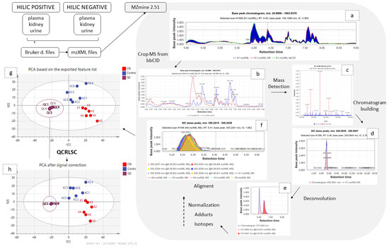 Graphical description of data pre-processing workflow. The low and high CE–MS before (a) and after (b) their separation; (c) set of noise levels for the mass detection; (d) one peak which resulted from the chromatogram building; (e) the chromatogram deconvolution; (f) the result of the alignment; the PCAs before (g) and after (h) signal correction.