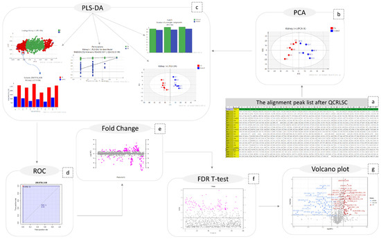 Graphical description of the statistical workflow for kidney (+), as follows: (a) the final peak list; (b) PCA; (c) PLS-DA; ( the number of PCs; the scores-plot the loadings plot; the content plot of a discriminant variable; the result of permutations test); (d) the ROC curve of a biomarker; (e) the fold change plot; (f) FDR-TT representation; (g) volcano plot.