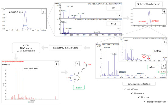 Graphical representation of identification workflow, employing the example of variable 254.1014_3.15. (a) Extraction of ion chromatogram, m/z = 245.1014, tR = 3.14; (b,c) refer to MS and MS2 spectra, respectively, corresponding to this peak area; (d) the area removed as background spectra; (e,f) represent the MS2 spectra before and after background subtraction, respectively; (g) MSMS match graph obtained from MCID, during the identification procedure; (h) the structural representation of biotin.