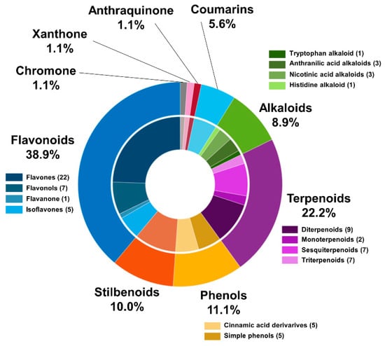 LC-HRMS/MS-based untargeted metabolomics approaches showed a considerable variation in compounds mainly belonging to the class of secondary metabolites of the flavonoids, stilbenoids, phenolic acids, chromones, tannins, terpenoids, and steroids. Dereplication methodologies have been extensively applied in plant metabolomics and provided the structural annotation of fifty-three metabolites belonging to different classes of natural products in aglycone and heteroside form. However, most putatively annotated polyphenols were classified as heterosides, mainly glycosylated flavonoids. Among the fifty-three compounds annotated, 35 metabolites were annotated as flavonoids (22 flavones, 7 flavonols, 1 flavanone, and 5 isoflavones) and 10 stilbenoids. Regarding the phenols class, 10 compounds were annotated, being 50% cinnamic acids derivatives. Among the 20 terpenoids detected, were annotated 9 diterpenoids, 2 monoterpenoids, 7 sesquiterpenoids, and 2 triterpenoids. The library matches showed alkaloids (8) classified as tryptophan alkaloids (1), anthranilic acid alkaloids (3), nicotinic acid alkaloids (3), and histidine alkaloids (1). Other oxygenated aromatic metabolites belonging to the coumarins (5), anthraquinones (1), xanthones (1), and chromones (1) classes were found in low abundance (Figure 1). Furthermore, a wide array of primary metabolites was detected in all samples, such as carbohydrates, amino acids, and lipids.