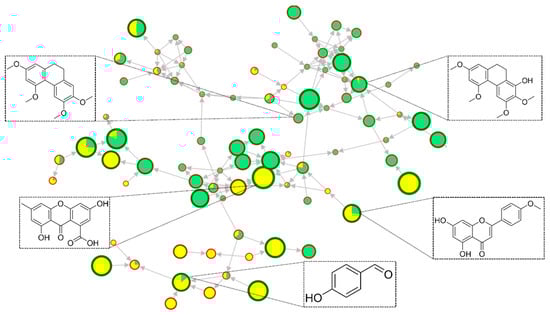 The metabolites cinnamic alcohol (phenylpropanoid), tricin 5-glucoside (flavonoid), loliolide (terpenoid), and allobetulinol (terpenoid) were detected only in samples of healthy plants. In contrast, the metabolites 3-(4-hydroxy-3-methoxyphenyl)propyl 3-(4-hydroxyphenyl)propanoate (phenol), salidroside (phenol), isovitexin (flavonoid), rutin (flavonoid), homoorientin (flavonoid), hyperoside (flavonoid), 2,3,5,7-tetramethoxy-9,10-dihydrophenanthrene (stilbenoid/phenanthrenoid), 4′-methoxy-6-methylflavone (flavonoid), isoshaftoside (flavonoid), sinapyl alcohol (phenylpropanoid), liquiritigenin (flavonoid), gigantol (stilbenoid), 3-O-Methylgigantol (stilbenoid), 4-methylcinnamic acid (phenylpropanoid), and isorhamnetin 3-galactoside (flavonoid) were detected only in samples of fungal-infected plants. Although the sample sets share a wide metabolic diversity, the metabolites were found at different levels of abundance since the activation of the plant defense mechanism can result in the greater activation of a biosynthesis pathway and suppress the synthesis of other metabolites. The flavonoids afrormosin, acacetin, and stilbenoids were primarily found in fungal-infected plants, while nitrogen compounds were found predominantly in samples from healthy plants. Since the infection by microorganisms induces biochemical alterations in the host organism in an attempt to defend itself from the aggressive agent [41,42,43,44], a wide diversity of metabolites was found in fungal-infected plants (Figure 3). The tricin derivative flavonoid, and the loliolide terpenoid, found only in healthy plant samples, are reported in the literature with promising antifungal activity [9,45,46].