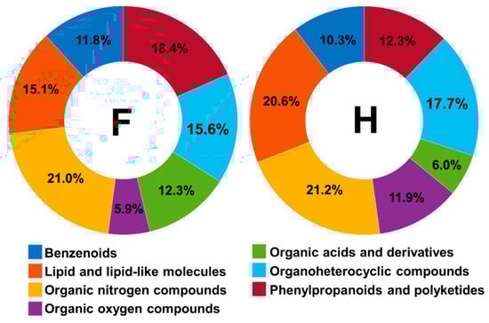 Nodes number detected through MolNetEnhancer at the “superclass” level for the samples of fungal-infected plants (F) and healthy (H) plants.