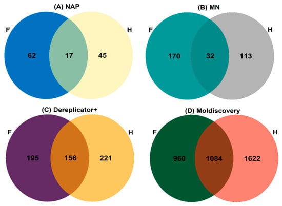 The propagation of structural annotations was also performed from unknown fragmentation mass spectrum analysis using the in silico tool Network Annotation Propagation (NAP), which yielded 62 metabolites putatively annotated from NAP-Fusion in silico prediction for fungal-infected plants and 45 for healthy plants samples. A Venn diagram represents the unique metabolites number and overlapped unique metabolites putatively annotated by classical Molecular Networking (MN), Dereplicator+, Moldiscovery, and NAP-fusion annotated metabolites obtained from fungal-infected plants (F) and healthy (H) plants (Figure 6).
