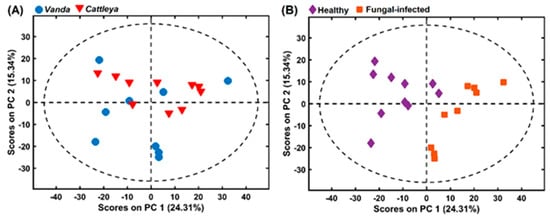 Principal component 1 (PC1) and PC2 explained 24.31% and 15.34% of the variation, respectively, as shown in Figure 7. Both Figure 7A,B are biplot scores of the same PCA, with (A) showing the genus (Vanda and Cattleya) differentiation and (B) the healthy and fungal-infected samples separation. In fact, only the healthy and fungal-infected separation was successful, mainly in the PC1. In this way, PLS-DA and OPS were applied to classify samples as healthy or fungal-infected to find the variables that contribute more to this separation.