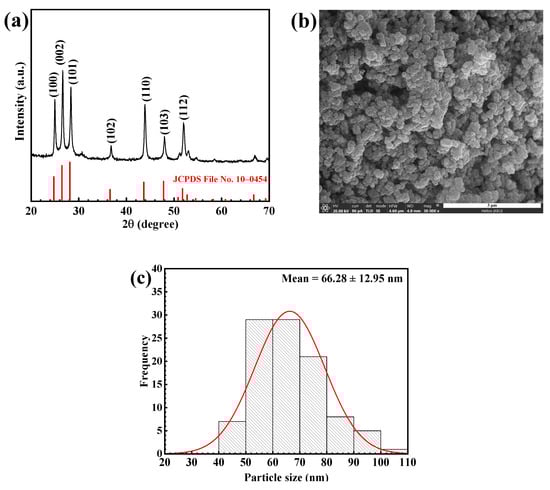 XRD pattern (a), FE—SEM micrograph (b), and size distribution (c) of the CdS nanoparticles.