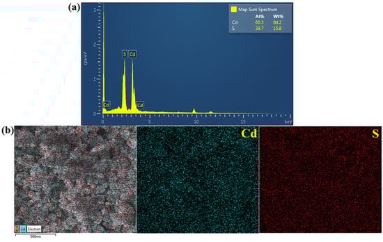 EDX spectrum (a), SEM image of the mapping area, and EDX elementary mapping of the Cd and S of CdS nanoparticles (b).