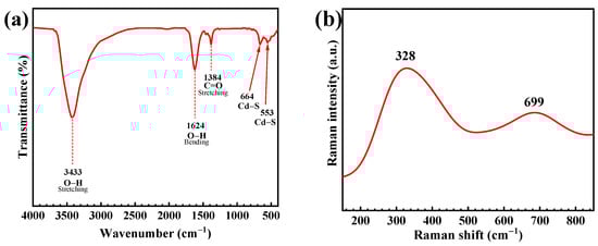 The FT-IR spectrum in Figure 3a exhibited the vibrational bands at 3433 cm−1 and 1624 cm−1, indicating the O-H stretching and bending vibration of adsorbed water on the CdS surface [17,30]. The band at 1384 cm−1 is due to the C=O stretching. Two peaks at 664 cm−1 and 553 cm−1 are related to the presence of the Cd-S bond [18,31]. The Raman spectrum (Figure 3b) showed two peaks located at 328 cm−1 and 699 cm−1. These are assigned to the first-order and the second-order longitudinal optical (LO) phonon mode, respectively, found in the prepared CdS.