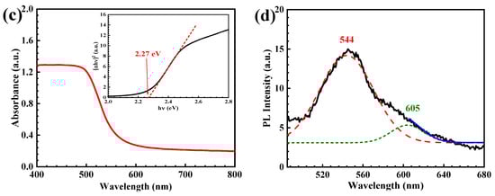 Figure 3c shows the UV–vis diffuse reflectance spectrum of the prepared CdS with the band energy (Eg) of 2.27 eV, determined from the Tauc plot [18]. Accordingly, the absorption edge of 546 nm over the visible light was obtained. Furthermore, the electron-hole recombination rate of the sample was determined from the photoluminescence spectrum (PL) in Figure 3d. Two peaks located at about 544 nm and 605 nm correspond to the near band edge (NBE) emission and the trapped emission, respectively [17,18,32].
