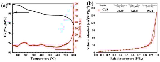 The TG and DTG curves of the prepared CdS (Figure 5a) showed two steps of weight loss over the temperature range of 30–800 °C. The first weight loss of about 1.8% below 200 °C might be assigned to the loss of physically absorbed water molecules [17]. The second weight loss of 4.1% between 300 to 800 °C may be due to the oxidation of cadmium ions in the air atmosphere [17]. The textural properties, including the specific surface area and pore size distribution of CdS, were elucidated from a multipoint BET of the nitrogen (N2) adsorption-desorption isotherm. Based on the IUPAC classification, the CdS exhibited a type IV isotherm. In addition, a distinct H3 hysteresis loop was found at high relative pressure (Figure 5b) [18]. The pore size distribution of the sample is shown in Figure 5c. A mesoporous catalyst showed a specific surface area of 34 m2/g with an average pore volume of 0.25 cm3/g and a mean pore diameter of 49 nm.