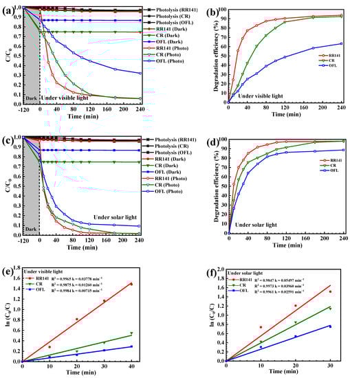 The removal of RR141, CR dyes, and OFL antibiotic was determined under visible light (a Panasonic daylight lamp, 15 W) and natural sunlight.
