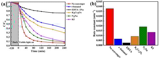 To investigate the main species involved in the complete removal of the pollutant, t-butanol, NaN3, EDTA-2Na, and K2Cr2O7 were added as a quencher of the hydroxyl radicals, superoxide anion radicals, holes, and electrons, respectively. Furthermore, KI was also added for quenching of surface hydroxyl radicals and photogenerated holes. In practice, 5 mM of each scavenger was added [2].
