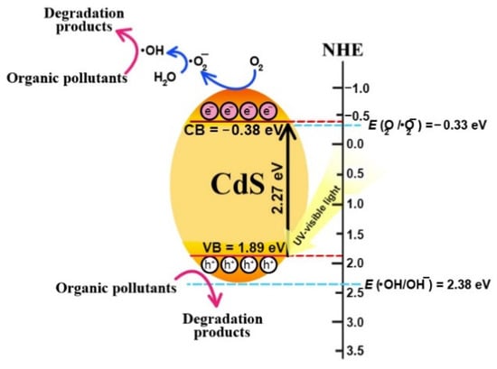 where EVB, ECB, and EC are the VB, the CB, and the standard hydrogen electrode potential (≈4.5 eV), respectively. χ is the absolute value of the electronegativity of the CdS catalyst. The VB and the CB levels of the CdS catalyst are 1.89 and −0.38 eV, respectively. The band gap of the CdS catalyst is 2.27 eV. In summary, the photodegradation mechanism of the toxic contaminant, in the presence of CdS photocatalyst, can be proposed as follows