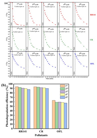 Reusability of the CdS nanoparticles for photodegradation of the RR141, CR dyes, and OFL antibiotic for five cycles under visible light irradiation (a), bar chart (b) showing the photocatalytic performance of the CdS nanoparticles toward photodegradation of the RR141, CR dyes, and OFL antibiotic for five cycles.