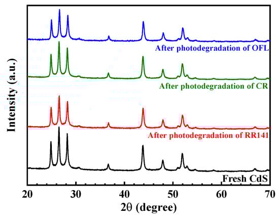 Reusability is a major factor influencing the practical use of the catalyst [2,18]. Therefore, the reuse of the prepared CdS after the degradation of the pollutants was investigated. The prepared CdS catalyst still shows great performance even after five times of use (Figure 9). The chemical structure of the CdS after the removal of the pollutants was also elucidated. The XRD patterns of the used and the fresh CdS (Figure 10) are similar, confirming the prepared photocatalyst’s structural stability.