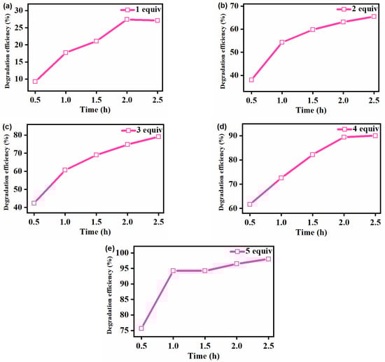 The effect of the reaction time on the degradation of the gentian violet was further examined at fixed concentrations of [FeIII(TCPP)] and gentian violet in the [FeIII(TCPP)]/PhIO system, and the results are presented in Figure 5, Table 2 and Figures S3–S6 in the Supplementary Materials. As shown in Figure 5 and Table 2, when using 1 equiv of PhIO, the degradation rate was the slowest and the degradation efficiency of gentian violet was the lowest compared with that of 2–5 equiv of PhIO. The degradation efficiency was basically unchanged after 2 h due to the insufficient amount of oxidant. When using 2 equiv and 3 equiv oxidants, although the corresponding degradation efficiency of gentian violet increased, the degradation rates were slow, and the degradation efficiency was only 65% and 79% after reacting for 2.5 h, respectively. When 4 equiv oxidant was used, with the increase in the reaction time, the degradation efficiency of gentian violet increased to 90%, but it remained almost unchanged after 2 h. When using 5 equiv oxidant, the degradation efficiency of gentian violet reached 75% within 0.5 h and 94% within 1 h, showing a remarkable degradation of gentian violet. The degradation products of the gentian violet produced by the [FeIII(TCPP)]/PhIO system after color removal were detected by GC-MS (Supplementary Materials, Figure S7). However, only iodobenzene (PhI) with a molecular weight of 204 was shown in the GC-MS results, which came from the reduction of PhIO. No product of the gentian violet was observed, which may have been due to the formation of high-boiling-point products, which could not be detected by GC-MS.