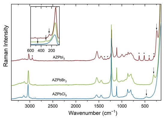 Raman spectra of AZPbX3 perovskites. Inset shows details of the low-wavenumber region, and asterisks (*) indicate bands from an impurity phase. Arrows indicate bands very sensitive to the type of halogen anion.