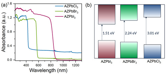 where R is a reflectance. Eg values were determined by plotting [F(R)·hν]2 versus energy (hν) (Supplementary Figures S2–S4). The excitonic peaks of AZPbCl3 and AZPbBr3 were subtracted from the Kubelka–Munk function to estimate the band gap with reasonable accuracy. The diagram of the determined energy band gaps of the investigated compounds is shown in Figure 2b. As can be seen, the smallest optical band gap equal to 1.51 eV is observed for AZPbI3, and it increases to 2.24 eV and 3.01 eV for AZPbBr3 and AZPbCl3, respectively. The determined values are in good agreement with those reported by Petrosova et al. [38]. It is worth adding that former studies revealed that 3D FAPbX3 perovskites have a slightly smaller Eg (3.03, 2.12–2.26 and 1.36–1.51 eV for FAPbCl3, FAPbBr3 and FAPbI3, respectively) than MAPbX3 analogues (2.88–3.177, 2.15–2.392 and 1.44–1.63 eV for MAPbCl3, MAPbBr3 and MAPbI3, respectively) [48,49,50,51,52]. Significantly larger band gaps were, however, reported for MHy-based perovskites (3.4 and 2.58 eV for MHyPbCl3 and MHyPbBr3, respectively [8,9]). Since the values reported in the literature for the FA and MA perovskites are scattered, we measured the absorption spectra of available MA and FA analogues and compared them with those obtained for AZPbX3. This comparison clearly shows that both the absorption edges and excitonic bands of AZPbX3 compounds are significantly red shifted compared to MAPbX3 (Supplementary Figure S5). A small red shift is also evident for AZPbBr3 when compared to FAPbBr3 (Supplementary Figure S5). Thus, the energy band gap of lead halide perovskites increases in the order AZ+ < FA+ < MA+ < MHy+. The largest band gaps of MHyPbX3 analogues can be attributed to the large distortion of their inorganic subnetworks [8,9]. The MA, FA and AZ lead halides crystallize, however, in the ideal cubic perovskites structure at RT (except for MAPbI3, which, at RT, is tetragonal). Therefore, different band gaps of these compounds cannot be attributed to different degrees of octahedral distortion. Our inspection of the crystallographic data shows that MAPbX3 analogues have much smaller lattice parameters than the corresponding FAPbX3 analogues and that these parameters increase slightly when going to AZPbX3. Therefore, it is evident that Eg decreases with the increasing size of the organic cation, thus leading to an increased lattice parameter and Pb-X bond length.