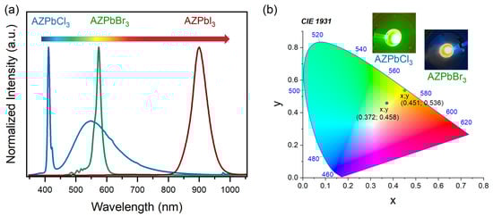 (a) Photoluminescence spectra of AZPbX3, where X = Cl, Br, and I were recorded at 80 K; and (b) CIE coordinates, together with pictures of glowing samples, of AZPbCl3 and AZPbBr3, respectively.