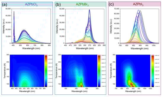Temperature-dependent emission spectra and PL intensity contour maps of (a) AZPbCl3 under 266 nm excitation, (b) AZPbBr3 under 450 nm excitation and (c) AZPbl3 under 450 nm excitation.