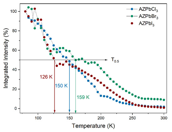 Studies of AZPbX3 samples show that, in all cases, FE band exhibits shift to higher energies upon heating and that the Ea values are small and fall within the 29–56 meV range. This behavior is similar to that reported for the MAPbX3 and FAPbX3 counterparts, which also showed a significant blue shift of PL upon heating [20,57,62] and small activation energies (105.21, 13–53.35, 21.67, 35 and 45 eV for MAPbCl3, MAPbBr3, FAPbBr3, FAPbI3 and MAPbI3, respectively [20,62,63,64].
