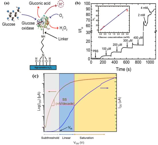 (a) Oxidation process of D-glucose by glucose oxidase enzyme produces protons that can modify the surface potential of an indium oxide FET; (b) Indium oxide FET electrical response to D-glucose concentrations in human diabetic tears (lower range) and blood (upper range), lower range, and upper range, respectively. Adapted from [78]. Copyright © 2015, American Chemical Society; (c) Different regimes of FET operation.