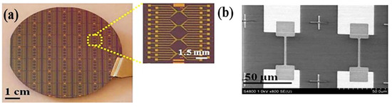 (a) Photograph of a 3-inch wafer with top-down fabricated In2O3 nanoribbon FT biosensors. Inset shows a magnified image of a nanoribbon chip composed of four subgroups of six nanoribbon FETs; (b) SEM micrograph of the nanoribbon FETs showing identical device channels precisely positioned on the source and drain areas, reproduced with permission from Ref. [23]. Copyright © 2015, American Chemical Society.