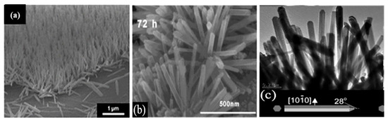 The wet chemical synthesis route is another solution-based technique to synthesize crystalline metal-oxide nanostructures compatible with the preparation of FET sensors. In wet chemical growth processes, metal-oxide seeds are first deposited either by spin-coating the seed solution or by sputtering a metal-oxide layer on a substrate [47,121]. The modified substrate is then exposed to a salt solution of the metal at an elevated temperature (~200 °C) to synthesize the nanostructures. This is a cost-effective and up-scalable way to synthesize crystalline metal-oxide nanostructures. For example, vertically aligned ZnO nanorods [46,84,122], ZnO NWs [116], and SnO2 nanorods [123] have been successfully fabricated using this approach (Figure 5).