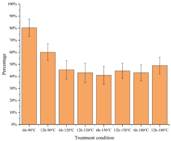 In addition, except for the two groups of 90 °C and 6 h and 120 °C and 6 h, the temperature change of the pretreatment had no obvious impact on the solid recovery. The obvious drop in the recovery rate was due to the extraction of a considerable amount of hemicellulose and lignin, which was also confirmed in the study of Lou et al. [28]. The pretreatment temperature was more effective on the pretreatment effect of wheat straw.