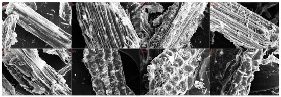 As shown in Figure 5a, natural biomass had a complete and smooth surface featuring an ordered fibrous structure. At the same time, the non-porous and rigid structure significantly prevented enzyme molecules from going into the wheat straw, so the cellulose accessibility was restricted. This was in contrast to Figure 5b,c, in which DES-pretreated wheat straw exhibited fiber separation and slight cracks at elevated temperatures. Furthermore, resulting from the removal of lignin and hemicellulose, the dense fiber bundles became loose and disorganized, which facilitated enzyme hydrolyses and penetration. Therefore, during the enzymatic hydrolysis, the cellulase obtained a suitable environment, and the enzymatic digestion efficiency of the cellulase was significantly improved. The more lignin and xylan removed, the greater the exposure of surface area and disordered fibrils, thus, improving cellulose accessibility [31,32,33]. Moreover, the resulting solid residue surface was not as smooth as anticipated since the residue after DES pretreatment still contained some non-fibrous components.