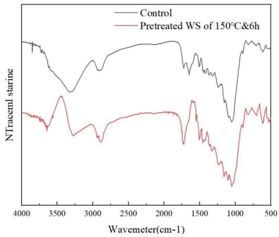 FTIR was performed to identify changes made on wheat straw after 150 °C and 6 h pretreatment. It is shown in Figure 6. Resulting from changes in β-glycosidic bonds between hemicellulose, cellulose, and glucose polymers, the C-O-C stretching of b-glycosidic bonds between sugar units in hemicellulose and cellulose exhibited uptake at 895, 1031, and 1159 cm−1 [34], which might be interpreted based on a large hemicellulose removal proportion [35]. The flattening of the peak at 1735 cm−1 indicated that in the hemicellulose carbonyl ester, the C=O acetyl group was obviously destroyed [34], and the absorption peak here was mainly from the carbonyl group in the hemicellulose (partly from the cellulose). The DES-pretreated samples exhibited significantly lower uptake compared to the untreated samples, indicating that a large amount of hemicellulose (from 24.98% to 6.64%) was removed during the pretreatment process, an observation consistent with the component content analysis results in Figure 3 [36]. The signal at 1363 cm−1 was assigned to C-H stretching, associated with amorphous and crystalline cellulose, respectively. At 1435 cm−1, the small peak reduction corresponded to the C-C stretching vibration of lignin ring aromatics [36]. At 2900 cm−1, the peak implied that alkane functional groups were discovered in the C-H stretching vibration, which indicated that a large amount of lignin was extracted into the DES system during the pretreatment process, thus reducing the lignin content in the pretreated wheat straw. As for the large peak band between 3000 and 3500 cm−1, it was attributed to the change of much hydroxyl-OH during the pretreatment process, where the vibration was extremely obvious, indicating that DES extracted many aromatic rings in wheat straw, the treated wheat straw polarity was weakened, and the binding ability with -OH was greatly reduced. Combined with the changes in component content (Figure 3), the FTIR spectrum proved that the pretreatment process could achieve the purpose of biomass fractionation of wheat straw.