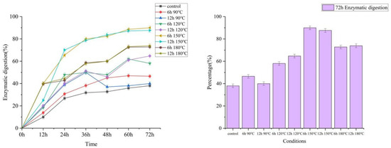To study the potential utilization value of pretreated wheat straw, further enzymatic digestibility assessments were performed on all pretreated solid residues. Figure 7 showed that when the pretreatment time was 6 h, enzymatic hydrolysis digestibility increased significantly as treatment temperature increased. The 72 h enzymatic digestion rate of 90 °C, 120 °C, 150 °C, and 180 °C were 46.56%, 58.06%, 89.98%, and 72.81%, respectively; when the pretreatment time was 12 h, the 72 h enzymatic digestion rates of 90 °C, 120 °C, 150 °C, and 180 °C were 39.97%, 64.72%, 87.63%, and 73.90%, respectively. This is similar to the study of Xie et al. [37]. However, it is worth noting that if the temperature increased from 150 °C to 180 °C, the enzymatic digestibility decreased from 89.98% to 72.81%, and the same trend was for the 12 h group, from 87.63% to 73.90%. If the temperature increased from 90 °C to 150 °C, the pretreatment would break the chemical bonds between hemicellulose, cellulose, and lignin, thereby significantly improving the enzymatic digestion rate. When the temperature was too high, that was, 180 °C, the pretreatment would cause more serious damage to the connection between lignin, cellulose, and hemicellulose, and this damage would make the broken lignin fragments cover the fibers again. Similar speculations and findings have been proposed by some researchers, such as Liu et al. [38], Isci et al. [39], and Chen et al. [40]. In fact, according to the SEM, as the treatment temperature increased, Cracks and crevices slowly began to appear on the smooth surface of the wheat straw, and then the wheat straw gradually became loose and disorganized. When the pretreatment temperature reached 180 °C, the structure of the wheat straw collapsed seriously. The surface coverage was also reduced. The 72 h enzymatic digestion rate ranged from 46.56% at 90 °C and 6 h to 39.97% at 90 °C and 12 h, from 58.06% at 120 °C and 6 h to 64.72% at 12 °C and 12 h, and from 89.98% at 150 °C and 6 h to 87.63% of 150 °C and 12 h, from 72.81% at 180 °C and 6 h to 73.90% at 180 °C and 12 h, there were two points worth noting here: firstly, the pretreatment effect was much worse than that of the pretreatment temperature; secondly, in the two groups of 90 °C and 180 °C, the pretreatment effect decreased with the increase in the pretreatment time. It proved that the intensity of pretreatment time was not as large as that of pretreatment temperature, the increase in pretreatment time would have a negative effect. When the pretreatment temperature was too high, the solid and liquid mixed in the slurry, the large lignin fragments covered the cellulose surface again for a long time, which reduced the digestibility during the enzymatic hydrolysis process. Combined with the effects of pretreatment temperature and time, the optimal pretreatment group was 150 °C and 6 h.