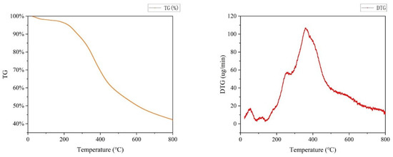 The purity of lignin was calculated based on the total amount of acid-soluble lignin (ASL) and acid-insoluble lignin (AIL) as a percentage of the total weight of the recovered lignin determined according to standard procedures [29]. Similarly, the average values were used for analysis. Thermogravimetric analyses (TG) of the specimens were tested on a thermal analyzer (TA Instruments Thermogravimetric Analyzer (TGA Q500), Waltham, MA, USA) system. Heat the specimens from 20 °C to 800 °C at 10 °C·min−1 under a nitrogen atmosphere (50 mL·min−1).