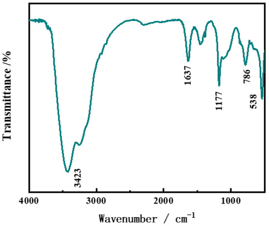 The chemical structure of hollow CoSn(OH)6 samples was studied using infrared spectroscopy and the results are shown in Figure 2 [27]. The wideband at 3423 cm−1 and the small peak at 1637 cm−1 represent the tensile and bending vibrations of the O-H bonds, respectively. The Sn-O bond’s stretching vibration and the Sn-OH bond’s bending vibration correspond to approximately 538 cm−1 and 1177 cm−1. The strong band at 786 cm−1 represents the H2O-H2O hydrogen bond.