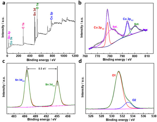 Figure 3 shows the surface composition of the hollow CoSn(OH)6 samples [10]. As shown in Figure 3a, the wide-range XPS measurement spectrum confirmed that the synthesized hollow CoSn (OH)6 material is composed of Co, Sn, and O elements, which is consistent with the EDX test results. Figure 3b is a high-resolution XPS spectrogram of Co 2p. The two peaks at approximately 778.0 eV and 794.0 eV correspond to Co 2p3/2 and Co 2p1/2, respectively. The satellite peaks located at 780.4 and 799.8 eV are usually caused by multi-electron excitation (pulse) or coupling between unpaired electrons (multistate splitting). In the high-resolution XPS spectrum of Sn 3d (Figure 3c), the high-intensity peak with a binding energy of 486.6 eV is Sn 3d5/2 and the peak at 495.1 eV is Sn 3d3/2. The peak of Sn 3d splits at 8.5 eV, indicating that Sn is in the chemical state of Sn (IV). The high-resolution XPS spectra of O 1s can be divided into two photoelectron peaks at 531.3 and 533.1 eV, considered lattice oxygen in hydroxide structure and oxygen in hydroxide ions, respectively (Figure 3d) [11].